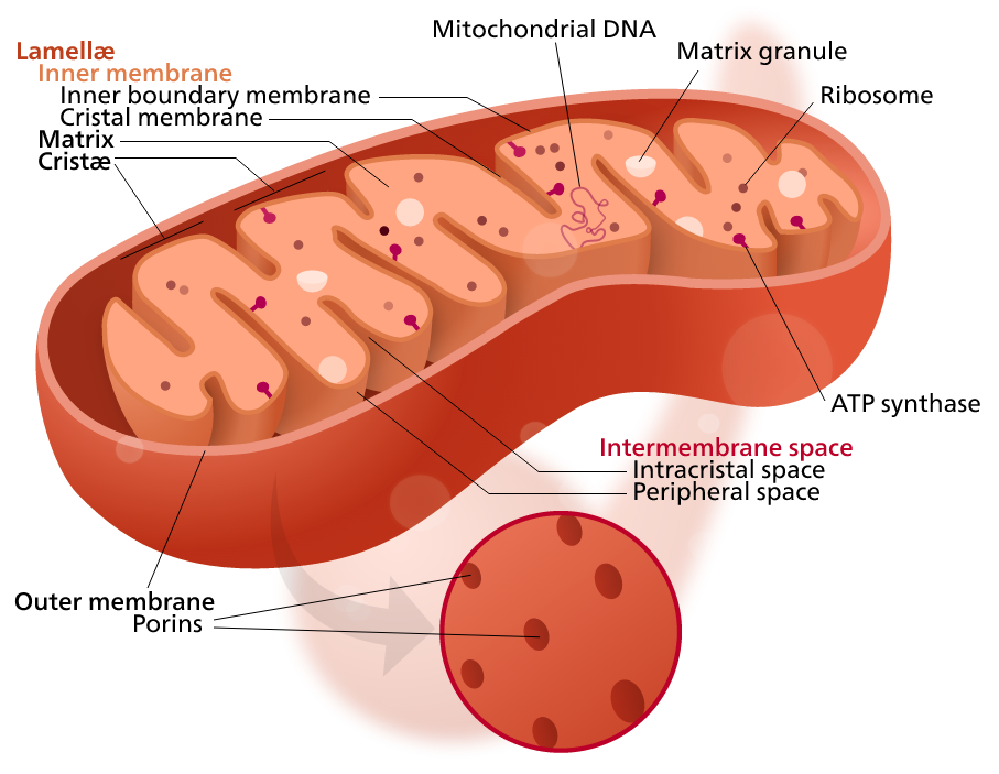 • Mellan det yttre och inre membranet finns cytochrome c från elektrontransportkedjan som är den enskilt största producenten av ATP. När apoptosen går igång blir mitokondriens yttre membran poröst och släpper ut cytochrome c till cellvätskan, cytoplasman. I en serie händelser aktiveras diverse enzymer, de sista i kedjan är caspase 3 och caspase 7, som bryter ner cellen i sina beståndsdelar för återvinning.