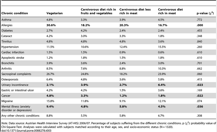 Conclusion: Our study has shown that Austrian adults who consume a vegetarian diet are less healthy (in terms of cancer, allergies, and mental health disorders), have a lower quality of life, and also require more medical treatment. Therefore, a continued strong public health program for Austria is required in order to reduce the health risk due to nutritional factors. Moreover, our results emphasize the necessity of further studies in Austria, for a more indepth analysis of the health effects of different dietary habits.